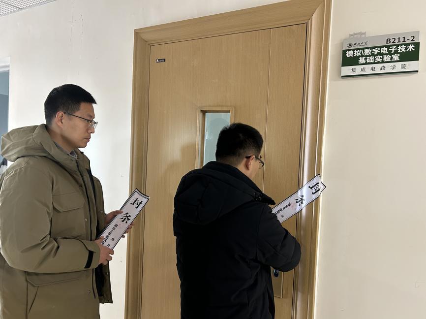 为迅速落实联合检查组整改指示,扎实推进节前安全闭环管理,当日下午李根主任与学院安全专员郭鹏老师开展寒假节前实验室安全复核与落实工作。二人对排查出的安全隐患逐一梳理、第一时间通报至各实验室安全责任人,督促限期整改到位;同时规范完成各实验室断水、断电、通风等节前准备工作,对所有实验室统一实施封条管理,从源头遏制安全风险,确保假期实验室安全防控无死角、无盲区、无漏洞。