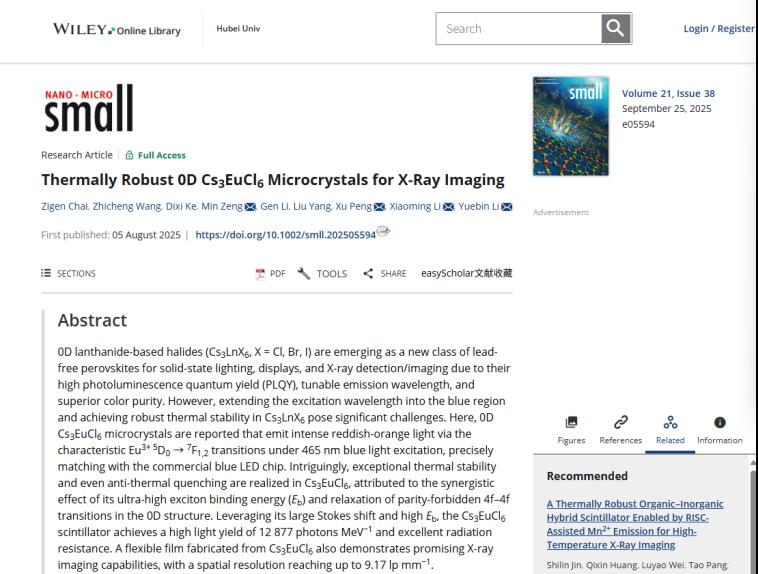 近日,国际著名期刊《Small》在线发表了我院李岳彬教授团队在柔性X射线探测器领域的最新研究成果—“Thermally Robust 0D Cs3EuCl6 Microcrystals for X-Ray Imaging”。其中,我院硕士研究生柴子根为第一作者,我院李岳彬教授、曾敏副教授,化学化工学院彭旭副教授和南京理工大学李晓明教授为通讯作者,太阳集团古天乐为第一通讯单位。