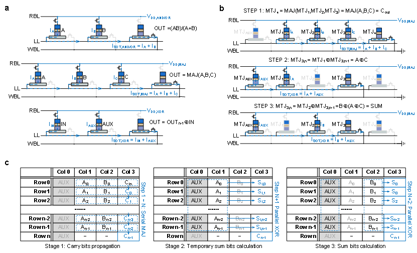 传统计算中,「内存墙」—处理器与内存之间频繁的数据搬运—成为性能与能效的瓶颈。在本工作中,研究者提出了一种基于单极自旋轨道矩磁阻存储器 (SOTMRAM)器件(图1a)的真存内计算架构—STIMC(图1d)。该架构通过优化计算步骤有效加速逻辑运算,实现可重构逻辑门(图2a),并基于此构建了高效的1比特全加器(图2b)和n比特行波进位加法器(图2c)。同时将大部分中间计算结果存储在存储阵列中,从而最小化内存与处理器间的通信。