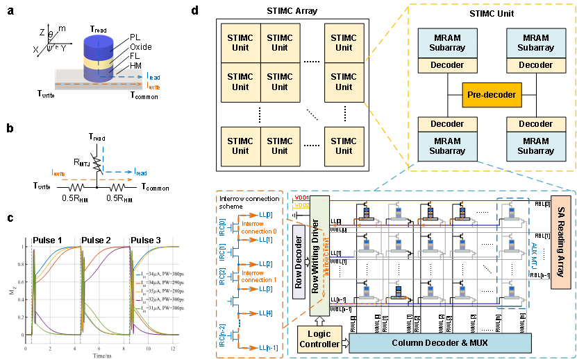 1 | STIMC各层级架构。a单极SOT-MRAM结构bSOT-MRAM等效电路c单极器件翻转特性dSTIMC计算架构)。