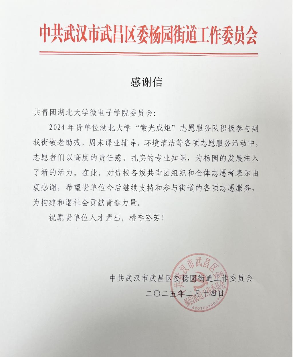 “微光成炬”暖人心!——9428cn太阳集团古天乐收到杨园街道感谢信