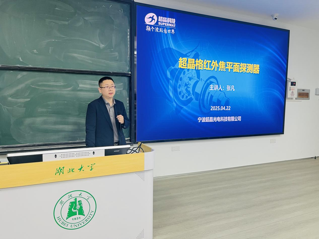 报告伊始,张凡博士立足国家战略需求,系统梳理了超晶格红外焦平面探测器在军事、工业、航空航天以及医疗等关键领域的广泛应用,并详细阐述了当前该领域面临的技术瓶颈。他从半导体器件物理和微电子工艺的角度出发,深入剖析了超晶格红外焦平面探测器的工作原理以及科研产业界的前沿动态,使复杂的理论知识变得通俗易懂,让在场师生受益匪浅。在分享个人经历时,张凡博士介绍了其在宁波超晶光电科技有限公司组建国内首个新型化合物半导体红外焦平面探测器批量生产研发团队的历程。他带领团队成功实现了基于二类超晶格技术的红外焦平面探测器产品的定型和批量生产,为我国在该领域的技术突破做出了重要贡献。张凡博士还强调:“超晶格红外焦平面探测器让我们换个波段看世界,其发展直接关系到国家安全和民生福祉。”他还指出,当前光电探测产业链仍存在诸多“卡脖子”技术问题,而行业对电科、光电、微电子和集成电路人才的需求正急剧增加。他鼓励在场学生珍惜在校时光,学好每一门基础课和专业课,并以自身经历为例,阐述了扎实的专业知识在实际工作中所发挥的关键作用:“等你们毕业后从事生产研发工作,就会深刻体会到当年为什么要学习量子力学、固体物理学和半导体物理等课程。”