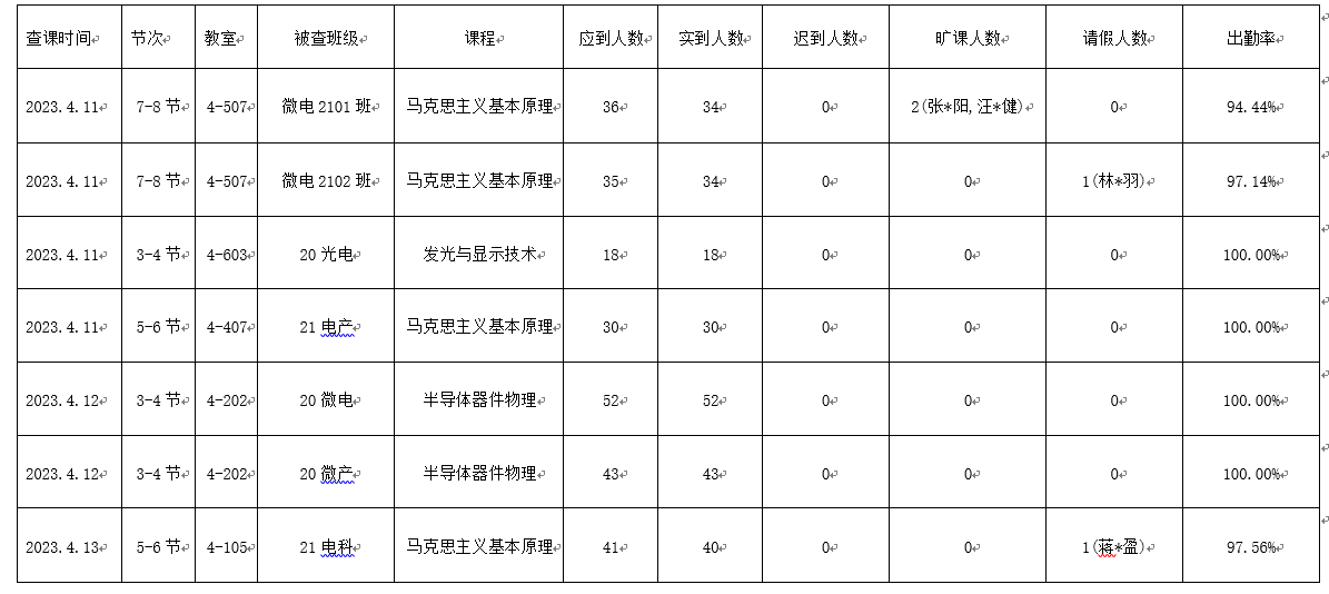 为深入贯彻党的二十大精神,构建优良学风建设长效机制,督促学生树立良好学习习惯,物理学院、9428cn太阳集团古天乐学生工作办公室第十周对学院部分班级上课情况进行抽查,现将抽查情况公示如下: